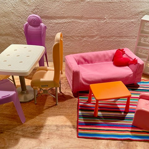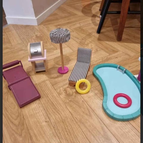 Alt hvad Barbie har brug for… køleskab, seng, toilet, badekar og sminke/frisør vask med spejl samt 2 fjernsyn og et telt. Der er også en ældre Barbie med 4 sæt tøj fra slut 80’ erne