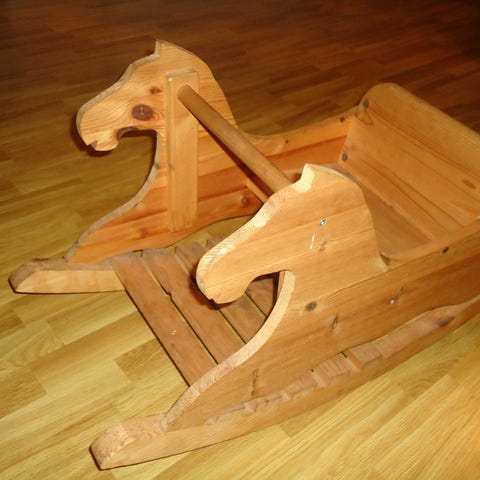 Gyngehest i stabil træramme, så den ikke kan vælte. Forlæg er nok en af de gyngeheste, der blev produceret tilbage omkring 1900 tallet.