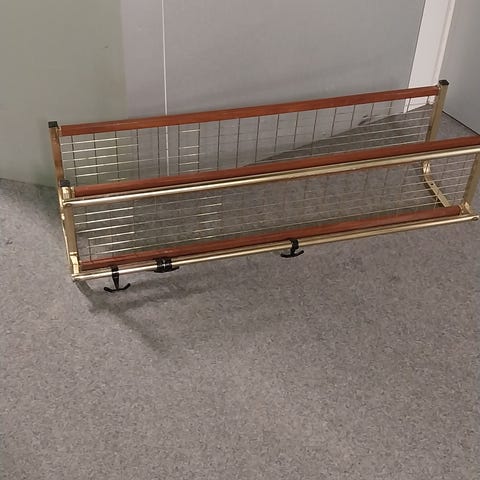Flot vintage hattehylde med messingstang og 4 knager fra svenske Bolaget Onosjö.