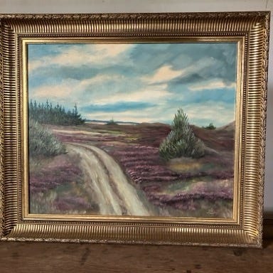 Flot, klassisk ramme med gylden kant – klar til ophæng. Maleriet er i god stand og ideelt til dig, der holder af dansk natur eller har tilknytning til området.