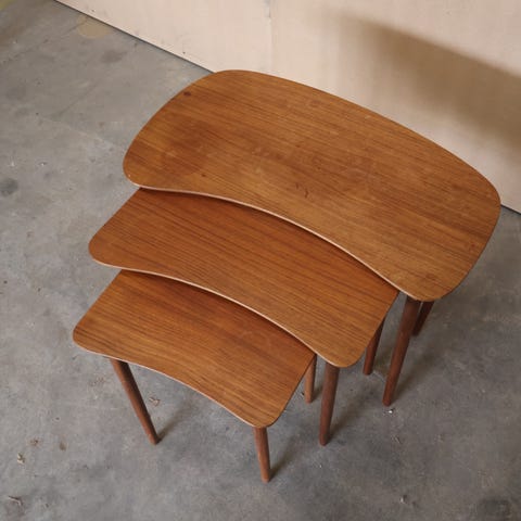 Sæt med tre flotte vintage indskudsborde i teaktræ. Klassisk dansk retrodesign fra 1960'erne med fine afrundede hjørner og runde ben.