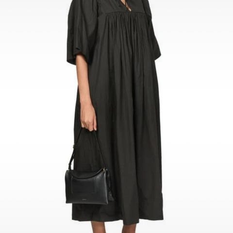Sort skjortekjole fra Skall Studio i 100% økologisk bomuld. Farven er helt sort - fotos snyder lidt. Den har stiklommer i siden, blonder og bindedetalje ved håndled. Str. M, måler 125 cm i længden og 56 cm fra ærmegab til ærmegab. Meget fin stand.