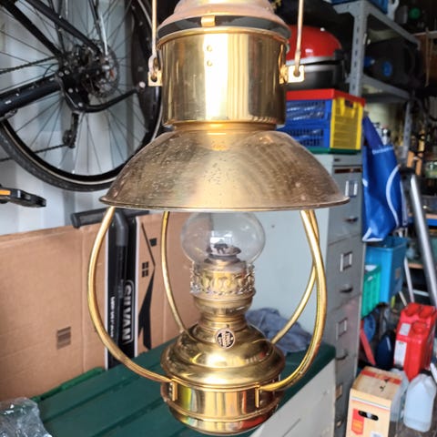 Flot messing olielampe med skærm og glas. Virker fint. Inkl. beslag til vægophæng så den altid holder sig lodret. Egnet som skibslampe.