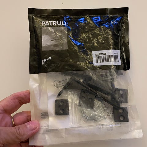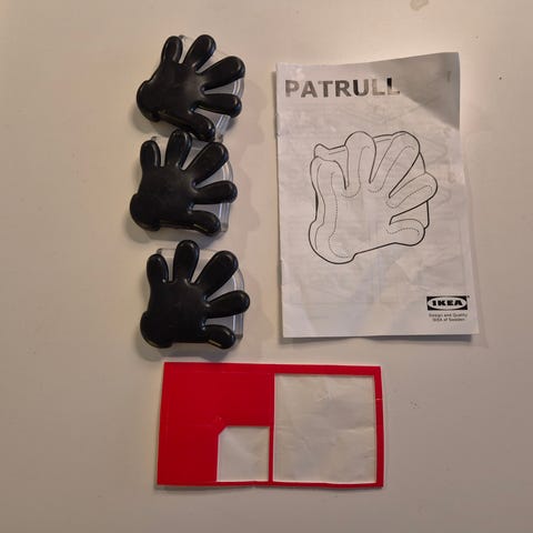 Sjove hjørnebeskyttere fra IKEA formet som Cartoon hænder. Der har oprindeligt været otte, men der er kun seks tilbage. Til f.eks. et bord skal der bruges fire, men til f.eks. en reol, der står op ad en væg, bruges kun to. Skal sættes fast med dobbeltklæbende puder. Disse indgår ikke.
