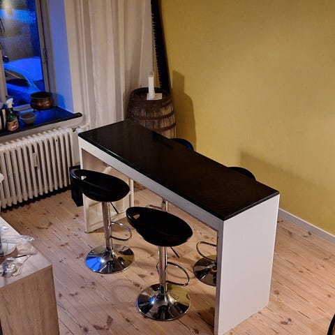 Sort bardbord med brugs ridser og 4 stole
