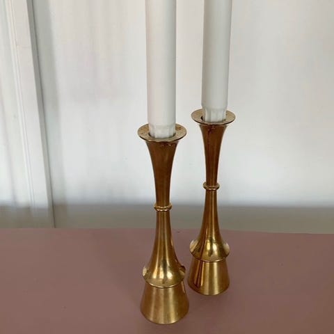 Et par lækre messing lysestager tilskrevet Jens Harald Quistgaard. Passer til standard kronelys. Højde 17,5 cm. God stand.