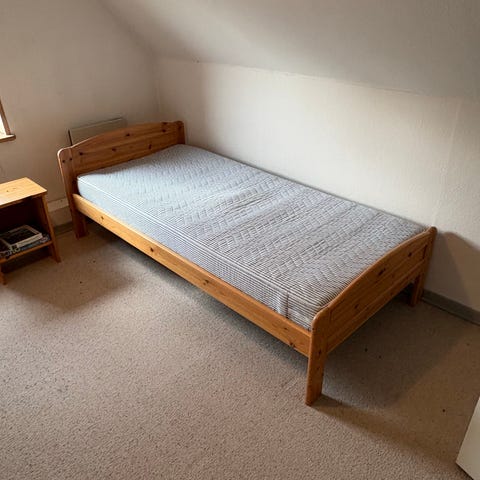 God, tyk madras fra Ikea (Vyssa) og et sæt robuste træ-lameller medfølger.