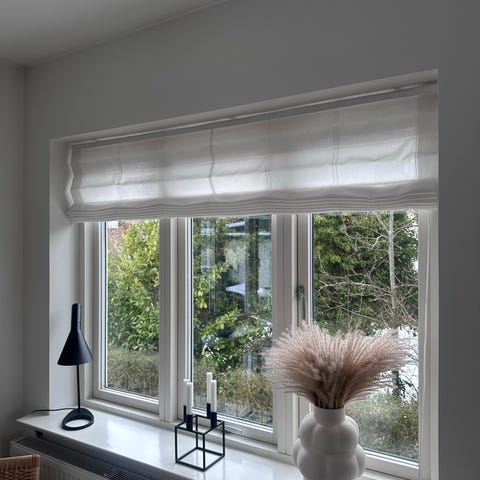 Fine foldegardiner i stof. 5 år gl. Er aldrig vasket før men det skal de. Støv & alm snavs fra brugen. Men kan meget nemt afmonteres da de sidder på med velcro og afstiver skinne kan let tages ud.