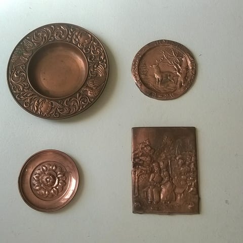 De fleste med dyr- eller jagtmotiver. Et med vikinger, en del med vildt og hest og så 2 x den lille havfrue. Der er et par kilo kobber.