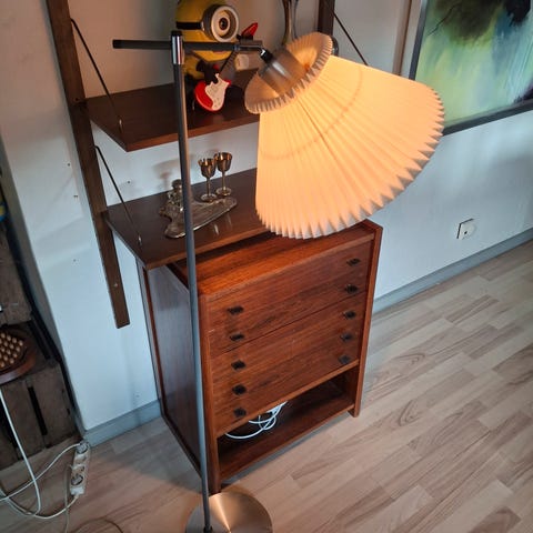 Smuk og sjælden "Kardinal" gulvlampe designet af Jo Hammerborg for Fog & Mørup. Udført i elegant kobber og detaljer i ægte palisandertræ, hvilket giver lampen et eksklusivt og tidløst udtryk.