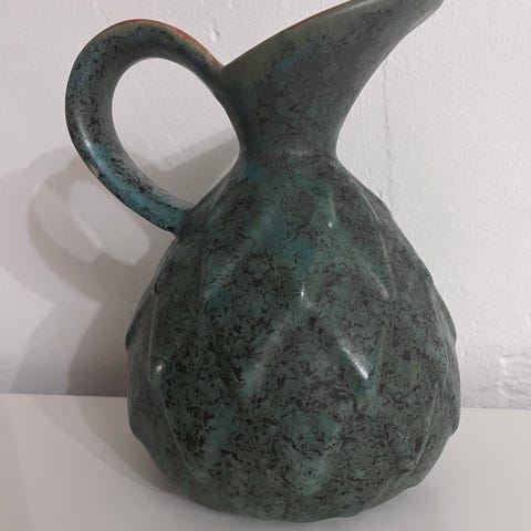 Sort glasur udvendigt og blå glasur indvendigt. Flot stand.