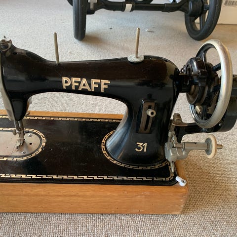 Pfaff håndsymaskine uden fod/bund. Føles som om den kører fint. Intet tilbehør.