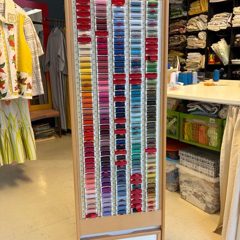Rigtig fin Gütermann reol med plads til mange ruller sytråd, ideel til det kreative syværksted ude som hjemme eller til stofbutik, med skuffe forneden, kan deles i to