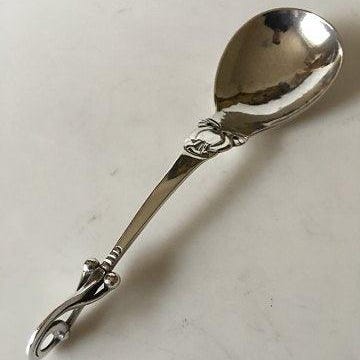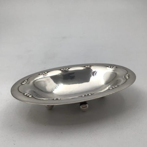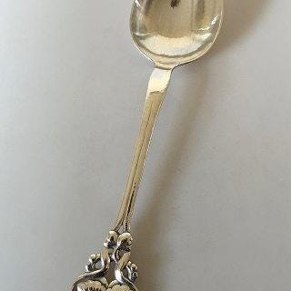 Georg Jensen Sølv Ornamental Saltske og Saltkar No 110. Måler 5 cm. Designet af Georg Jensen (1866-1935) Georg Jensen var en verdens berømt sølvsmed, der skabte sølvprodukter af kunstnerisk og håndværksmæssig højeste kvalitet. Hans virksomhed har igennem tiden haft over 90 designere. Jensen var meget kunstnerisk som barn og da han var 14, flyttede familien til København, så han kunne komme i lære hos en guldsmed. Hans ønske var dog at blive billedhugger, så han blev optaget som skulpturstuderende på Det Kongelige Kunstakademi i København, hvorfra han dimitterede i 1892 som 25-årig. I tiden efter, mødte han Johan Rohde, maler, designer, billedhugger, forfatter og arkitekt, der sammen med Joakim Skovgaard havde grundlagt Den Frie Udstilling, hvor Jensen blev tilbudt at udstille sin skulptur, som var blevet afvist på Charlottenborgudstillingen. Jensen fik et rejselegat af Det Danske Akademi. Han blev han inspireret af jugendstilen, hvor skønhed og nytte smeltede sammen. An besluttede selv at forene det smukke og praktiske. Jensen tog et job hos Mogens Ballin, dansk Art Nouveau kunstner. Ballin tillod kunstnerne, der arbejdede for ham, at udstille deres værker under egne navne og han gav Jensen kommission. 1904 besluttede Jensen sig for at åbne egen sølvforretning. Han beskæftigede sig med smykker, da det krævede en lille investering. Samme år udstillede han for første gang som selvstændig sølvsmed på Kunstindustrimuseet i København, hvilket var en succes, der kunne mærkes på værkstedet, hvor salget voksede støt. Hans succes med smykker, fik ham til at lave korpus. Han lavede en tekande med det velkendte blomstermotiv ”Magnolia”, hvilket blev prototypen for et hel te/kaffestel. 1916 blev selskabet GEORG JENSEN SØLVSMEDIE A/S stiftet Han vandt Grand Prix på verdensudstillingen i 1927, 1929, 1932 og 1935. Georg Jensen havde fem børn og afgik ved døden i 1935 som 69-årig.