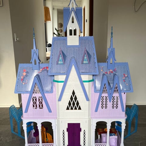 Meget velholdt Anna og Elsa slot/Arendal Disney slot, som kommer med sjove detaljer (seng kan laves til sminkebord). Elsa følger med sammen med nederdel og sko, ligesom bord + stol og dyne i bedste Arendal stil. Rigtig fint og velholdt. Minimalt brugt, så fremstår som ny.