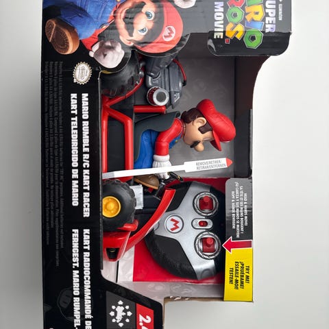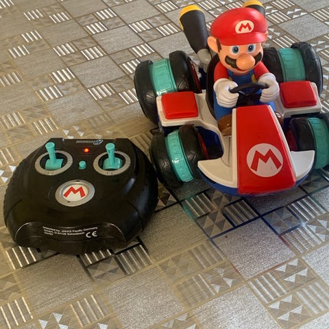 Sælges: Brugt fjernstyret Mario Kart 8 bil med Mario-figur. Bilen er i god stand og har få tegn på brug. Den er testet og virker som den skal. Perfekt til en fan af Mario eller RC-biler.
