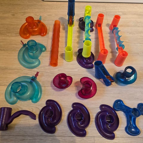 fin kuglebane fra b toys, der medfølger 7 glaskugler. nypris 700kr