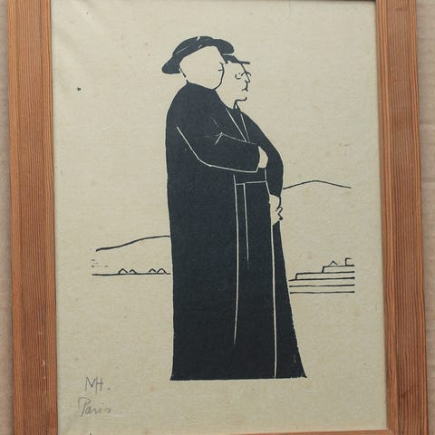 træsnit, Antik dansk træsnit. Titel: Syngende Dervischer. Fra 1887. Dette er et originalt træsnit (Xylografi.) udklippet fra en original dansk avis fra 1800 tallet, der hed Illustreret Tidende. På bagsiden af rammen er udklip af original forside, dato og titel m.m. Påsat for at dokumentere oprindelse af træsnittet til eftertiden. Monteret i hvidmalet træramme og glas. Mål med ramme: 31x25 cm. Stand: se billeder. OBS! Messing staffeli ikke inkluderet i prisen.