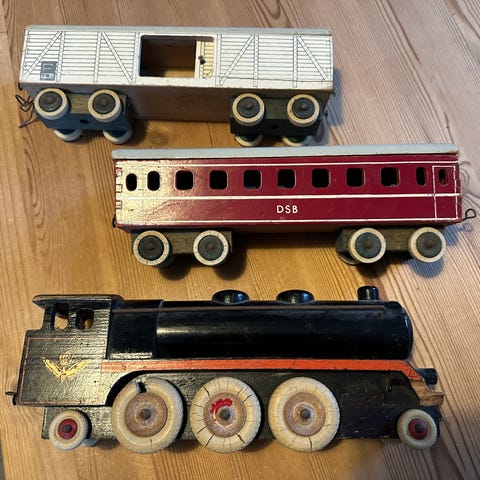 DSB trætog bestående af et lokomotiv og flere vogne. Toget er malet i sort, rød og sølvfarvet med DSB-logo på siderne. Materialet er træ. Passer til samling eller som dekorativt legetøj.