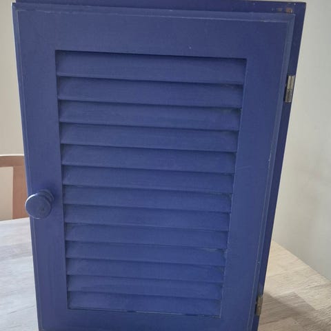 Det fineste lille vintage vægskab med fine afrundede hjørner og en elegant transparent blå knop til at tage fat i, når du vil åbne lågen.