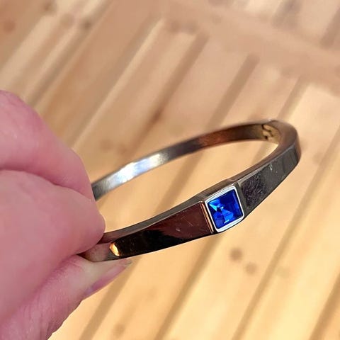 Sødt forsølvet armbånd med skiftesvis klare og blå sten samt et blåt hjerte som vedhæng. Armbåndet er 6 mm bredt og det kan lukkes fra 19 til 25 cm. Det er helt nyt