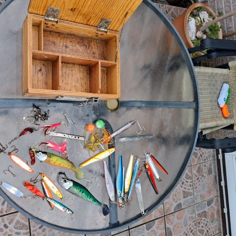 * Synk/lod: To store blylod til tungt havfiskeri eller dybt vand. Det ene er et pænt stort et. Kasse med assorterede bly lodder.