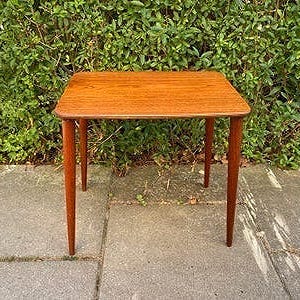 Mindre lampebord/sidebord,stålstel med nylonflet og plade i teaktræ.