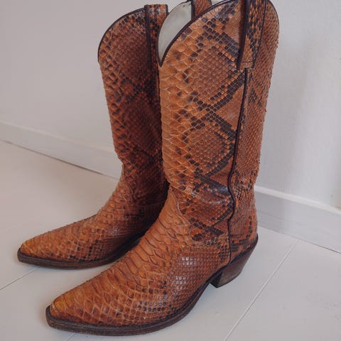 Smarte cowboystøvler i blødt lysebrunt skind og høj hæl.