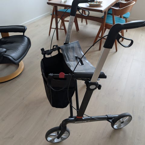 Ny Taima XC rollator i farven rød med store luftfyldte hjul for lettere manøvrering. De luftfyldte hjul giver god affjedring og komfortabel kørsel. Den er udstyret med sæde til hvile, kurv til opbevaring og bremser på håndtagene for ekstra sikkerhed. Virkelig gedigen kvalitet i stabil og robust udførsel. Kun brugt udendørs 2 gange. Velegnet til både indendørs og udendørs brug. Nem at folde sammen, vægt 9,1 kg. NY PRIS: 3.595,00.