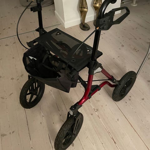 Ny Taima XC rollator i farven rød med store luftfyldte hjul for lettere manøvrering. De luftfyldte hjul giver god affjedring og komfortabel kørsel. Den er udstyret med sæde til hvile, kurv til opbevaring og bremser på håndtagene for ekstra sikkerhed. Virkelig gedigen kvalitet i stabil og robust udførsel. Kun brugt udendørs 2 gange. Velegnet til både indendørs og udendørs brug. Nem at folde sammen, vægt 9,1 kg. Med til rollatoren hører også en helt ny rygstøtte, som aldrig har været pakket ud. NY PRIS for rollator: 3.595,00 kr. NY PRIS for rygstøtte: 589,00 kr. Sælges samlet for kr. 2.900,00 kr.