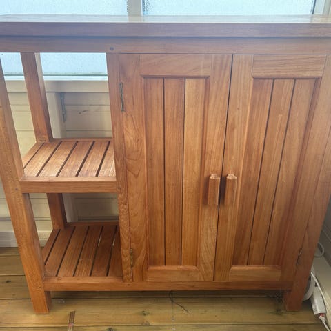 Flot skænk i teaktræ med hvid og sort låge. God og rummelig. Lågerne fungerer upåklageligt. Skriv endelig ved spørgsmål.