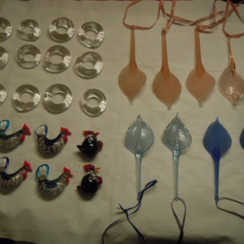 12 glasmarkører på en lygtepæl med en lille hund foran. Tysk fra 1950'erne. Mærket Ru-Ra Qualität. Ca. 11 cm høj. I original emballage, og alle glasmarkørerne er der.