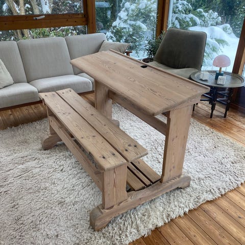 Vintage træ skoebænk fra Sverige til børn i en flot patineret brun farve. Dette møbel er lavet af træ og har en integreret stol med ryglæn. Perfekt til børneværelset som et funktionelt og klassisk indretningselement.