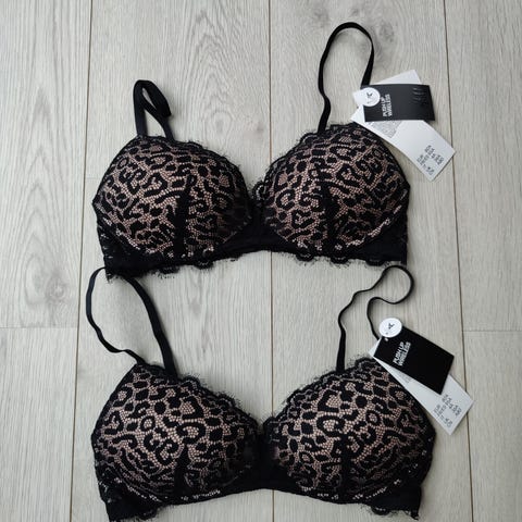 Stropløse bh’er i str. 75D. Beige og sort. Købt for 3 måneder siden, men de er for store i omkredsen for mig, så de må videre.