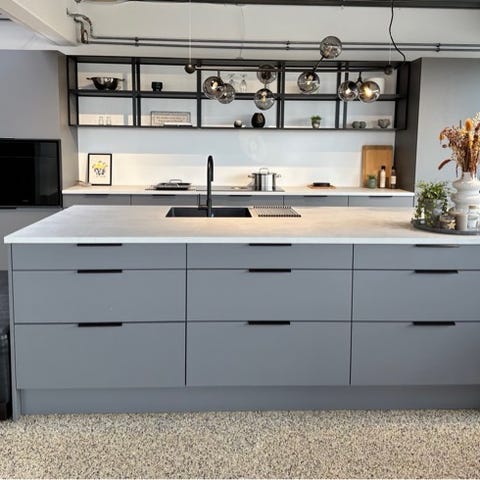 Vi sælger dette fine udstillingskøkken med Lys Grå folie fronter.