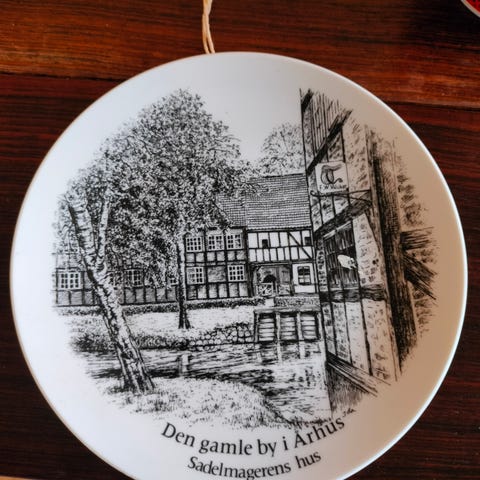 Fin gråblå platte fra Kera fra 1972, som viser et produktionsmiljø og har forkortelsen DMA skrevet rundt i kanten.