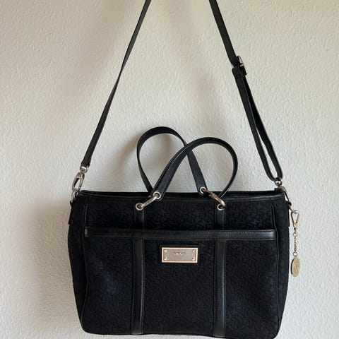 Skuldertaske / håndtaske / shopper fra DKNY i sort stof med læder stropper.