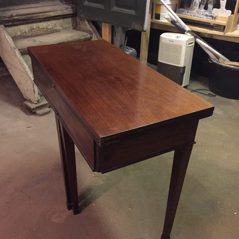 Antikt ovalt mahognibord, som i mine bedsteforældres hjem blev brugt til kortspil. Med smukke udskæringer. 2 tilhørende stole, som trænger til nyt betræk. Små ridser i kanten hist og her