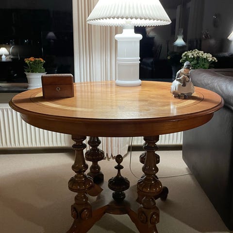 Antikt ovalt mahognibord, som i mine bedsteforældres hjem blev brugt til kortspil. Med smukke udskæringer. 2 tilhørende stole, som trænger til nyt betræk. Små ridser i kanten hist og her…