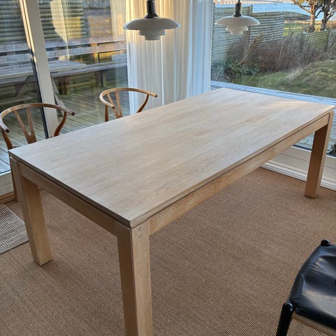 Bordet står stabilt og solidt – og passer både som spisebord, mødebord eller i et stort køkken/alrum.