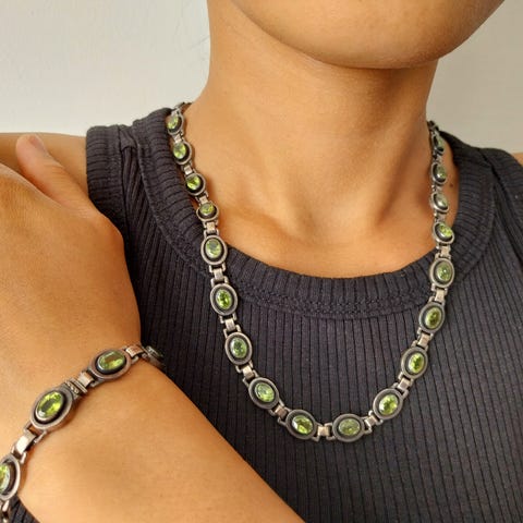 Udført i sterling sølv med 13 facetslebne peridot sten, god kvalitet sten ca 8x6mm pr. stk.