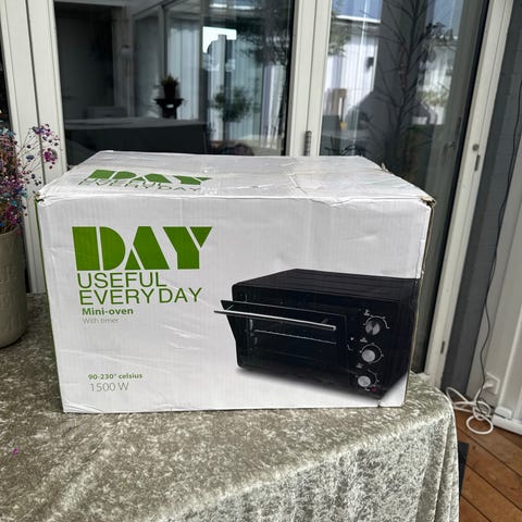 Miniovn på 38 L med varmeluft og grill samt indsats til fjerkræ. Ovnen er købt september 2024 og brugt i ca. 6 mdr. i studiebolig. Kvittering medfølger. Det er et par ridser i emaljen indvendig, se billede. Ovnen fungerer godt.