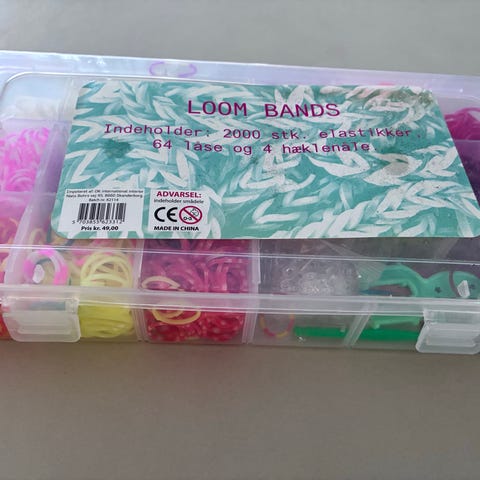 To væve, elastikker i sorteringsboks og bog med 60 opskrifter.