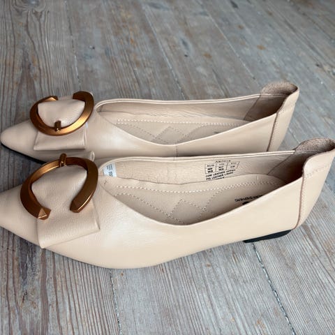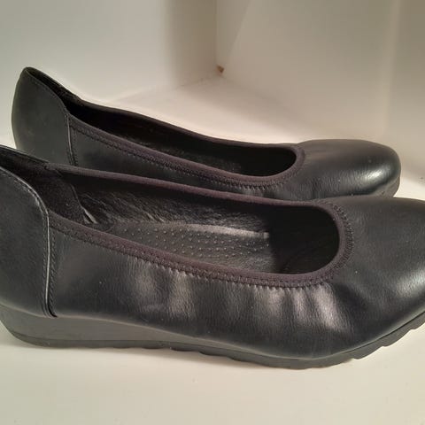 Ballerinasko med metalspænde, gummisåler og bløde såler indeni. Farven er sort. Skoene er kun prøvet og gået lidt i indendørs.