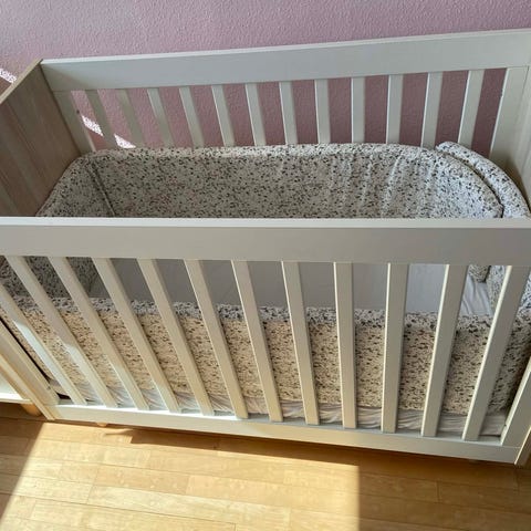 Fin solid og stor tremmeseng af mærket ‘Bino’. Dansk produceret. Har brugsspor hist og her - se billeder. Bunden kan sættes i 3 forskellige højder, og den ene side kan højdejusteres eller tages helt af. Brugt til min søn nu på 3,5 år, som stadig passer den, men af praktiske årsager havde vi brug for en seng med noget opbevaring under. Dunlopillo madras følger med.