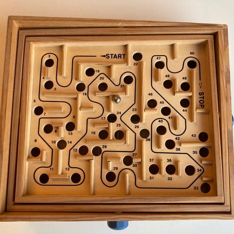 Vægspil fra Holz Klang & Spiel. Lavet i træ. Kuglespil til montering på væg. Barnet / eller den barnlige, skal koordinere sine bevægelser for at få kuglen rundt på “ banen” Beregnet til : Institution - konsultation værelse eller hvis du virkelig vil forkæle og udfordre dit barn. ( ny pris er ca 1500kr ) Va 48 cm i diameter Fremstår meget velholdt.