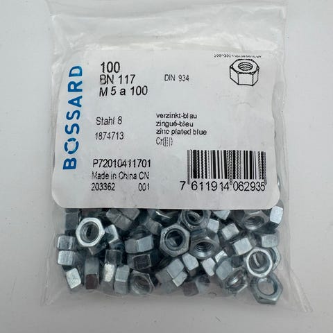 Sælger en ubrugt kasse med 1.000 stk hexagon låsemøtrikker fra Bossard, varenummer 1094920 (BN 161, DIN 985).