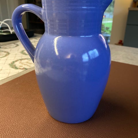 Blå glas kander- høj slank med gennemsigtig hank 25 cm 75kr, buttet kande 20cm 100kr