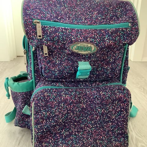Grå skoletaske med plads til drikkedunk. Flere rum og clips hvor nøglen kan sidde. Termo hvor madkassen skal være. Fin stand - 175 kr.