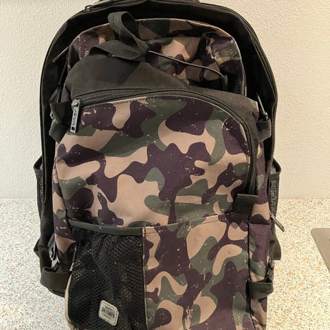 Camouflage skoletaske med plads til drikkedunk og penalhus i hver side. Et stort rum og en clips hvor nøglen kan sidde. Termo hvor madkassen skal være. Fin stand - 200 kr.